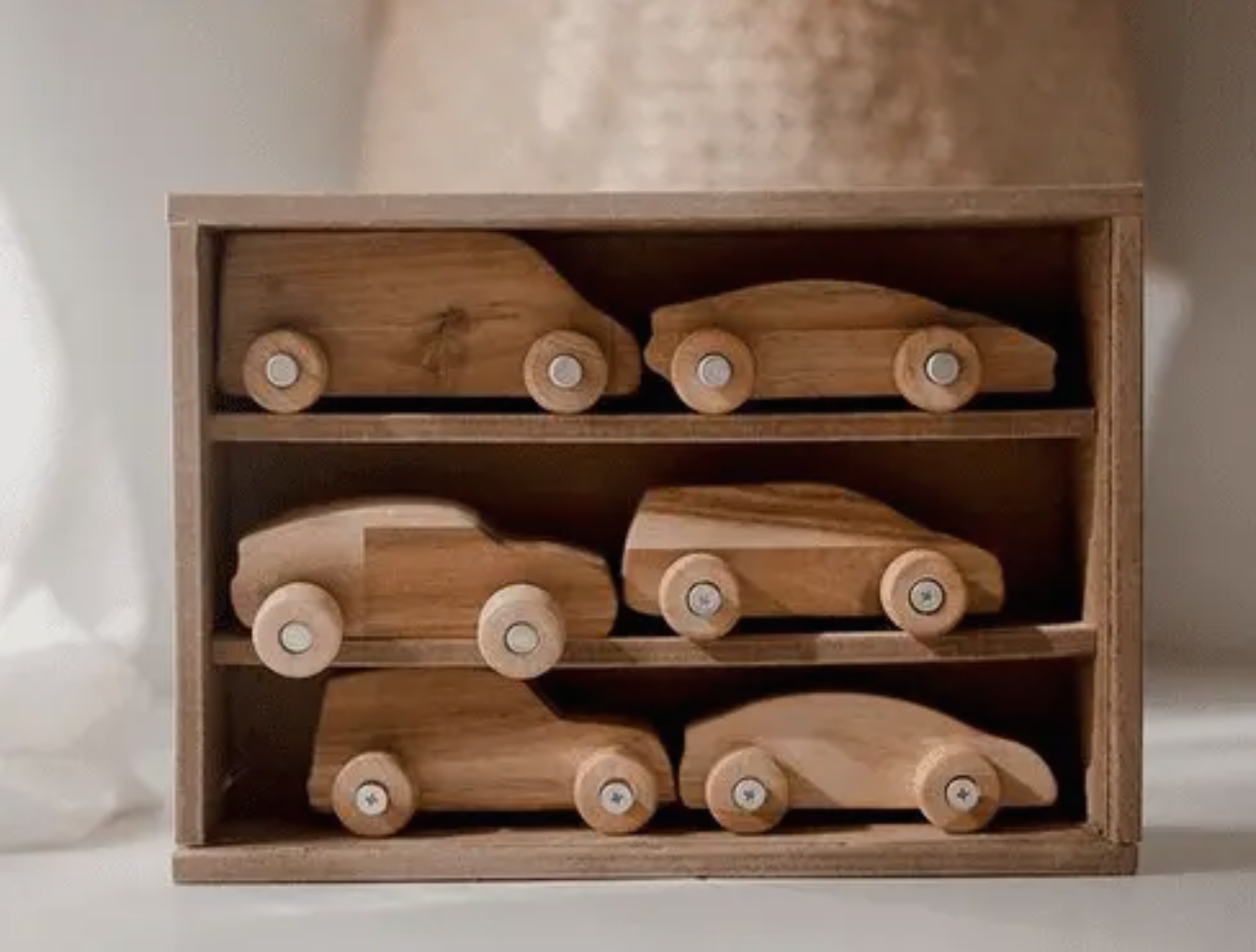 Beautiful handmade wooden car set. The set includes 6 different car models, all carefully oiled with a beeswax finish. The set is housed in a wooden box with a clear lid. All Qtoys are made of plantation timber, using non-toxic, child safe material.
