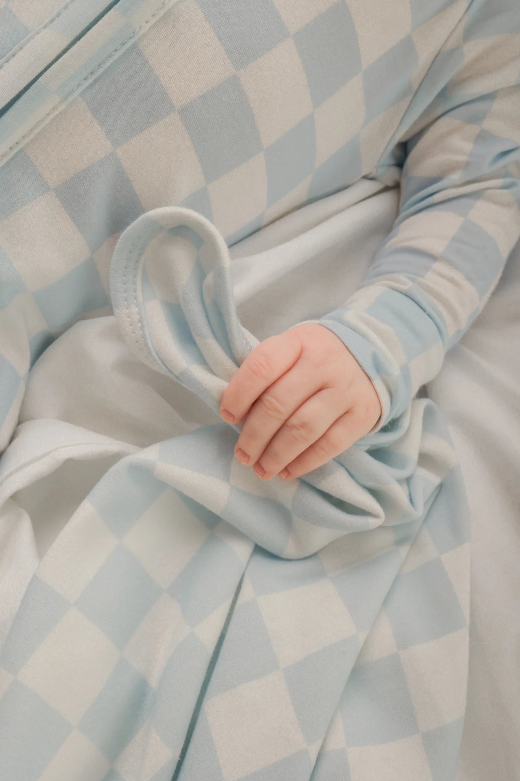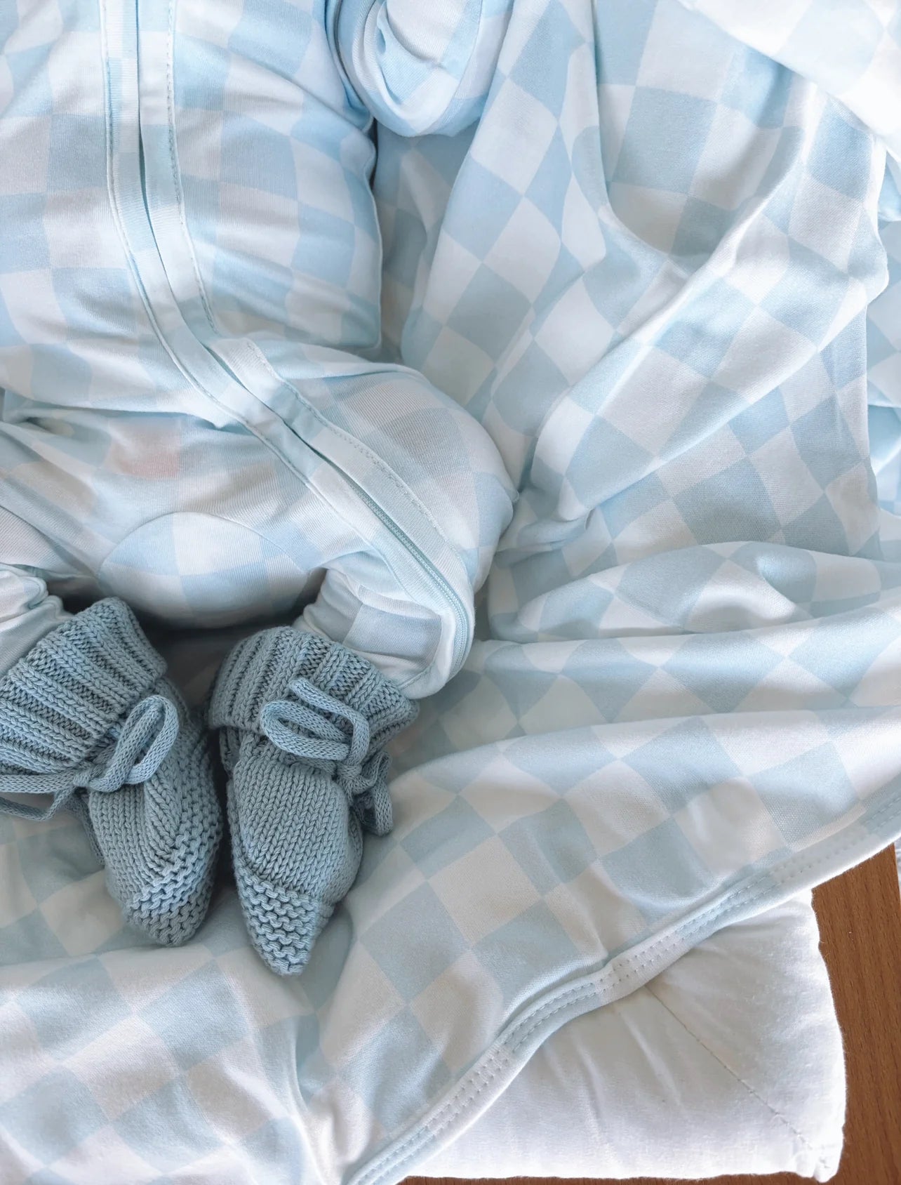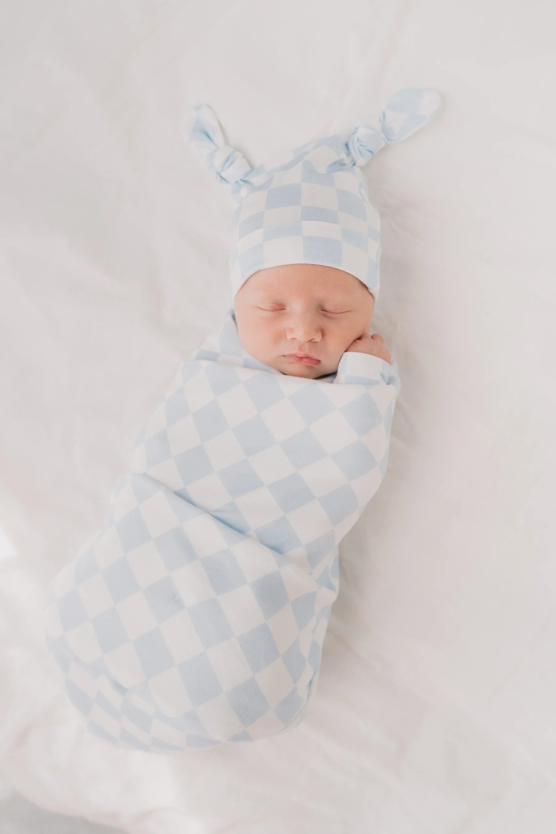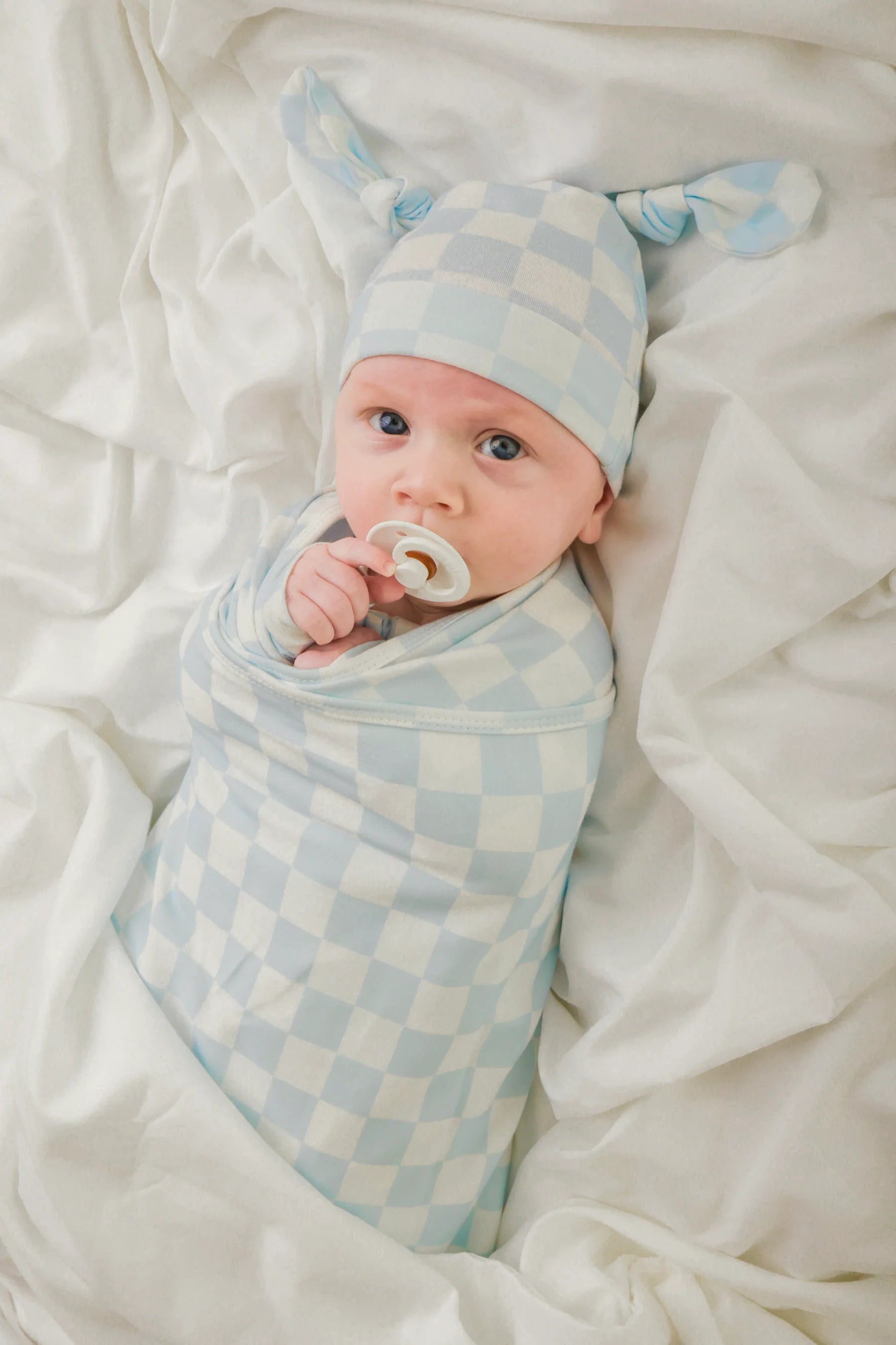 Introducing our popular stretch swaddle in our newest design, Blue Checker
