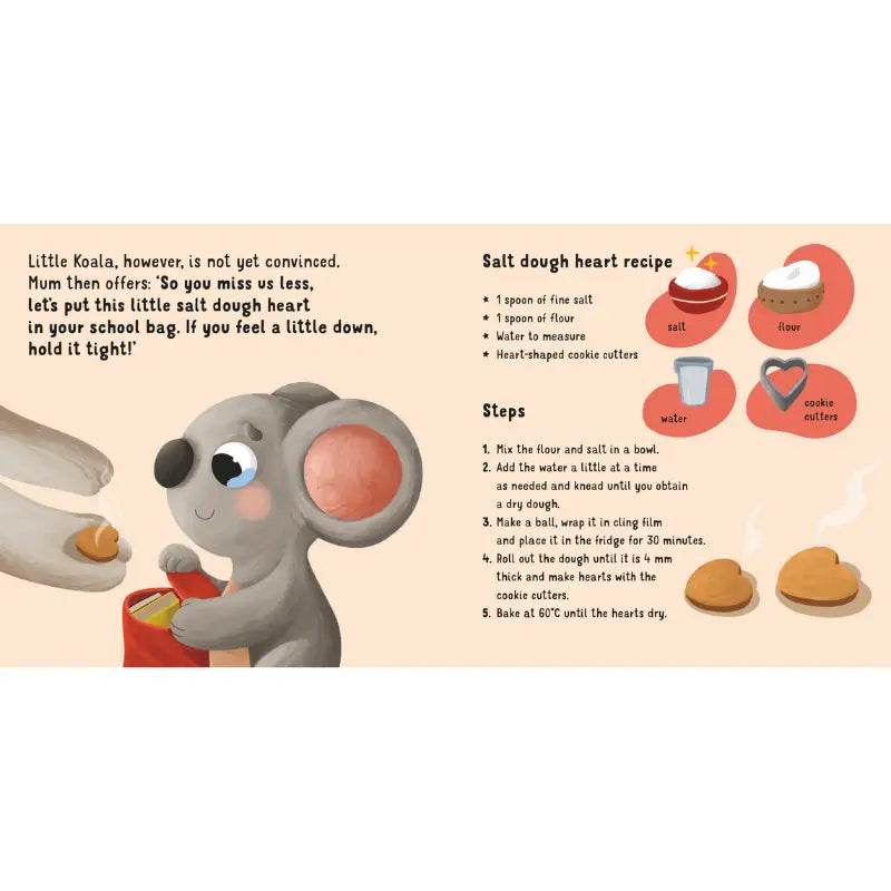 Little Koala is about to start kindergarten and will stay away from his parents longer. With the guidance of his parents, teacher, and a special salt dough heart (recipe included!), Little Koala will confidently face this separation and the start of school.