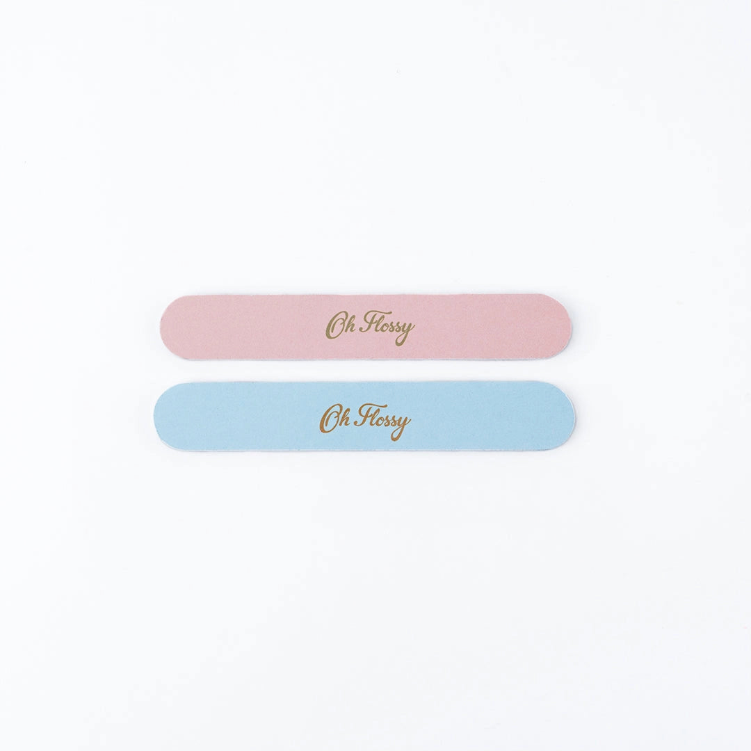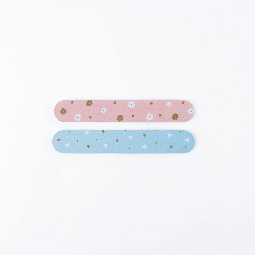Each pack comes with a set of two (2) files.  The pink design features the signature Oh Flossy flowers and the blue design is dotted with hearts and stars.  Both are made specifically for kids, with a grit of 240/360 and sized for little hands of 12 x 2cm.