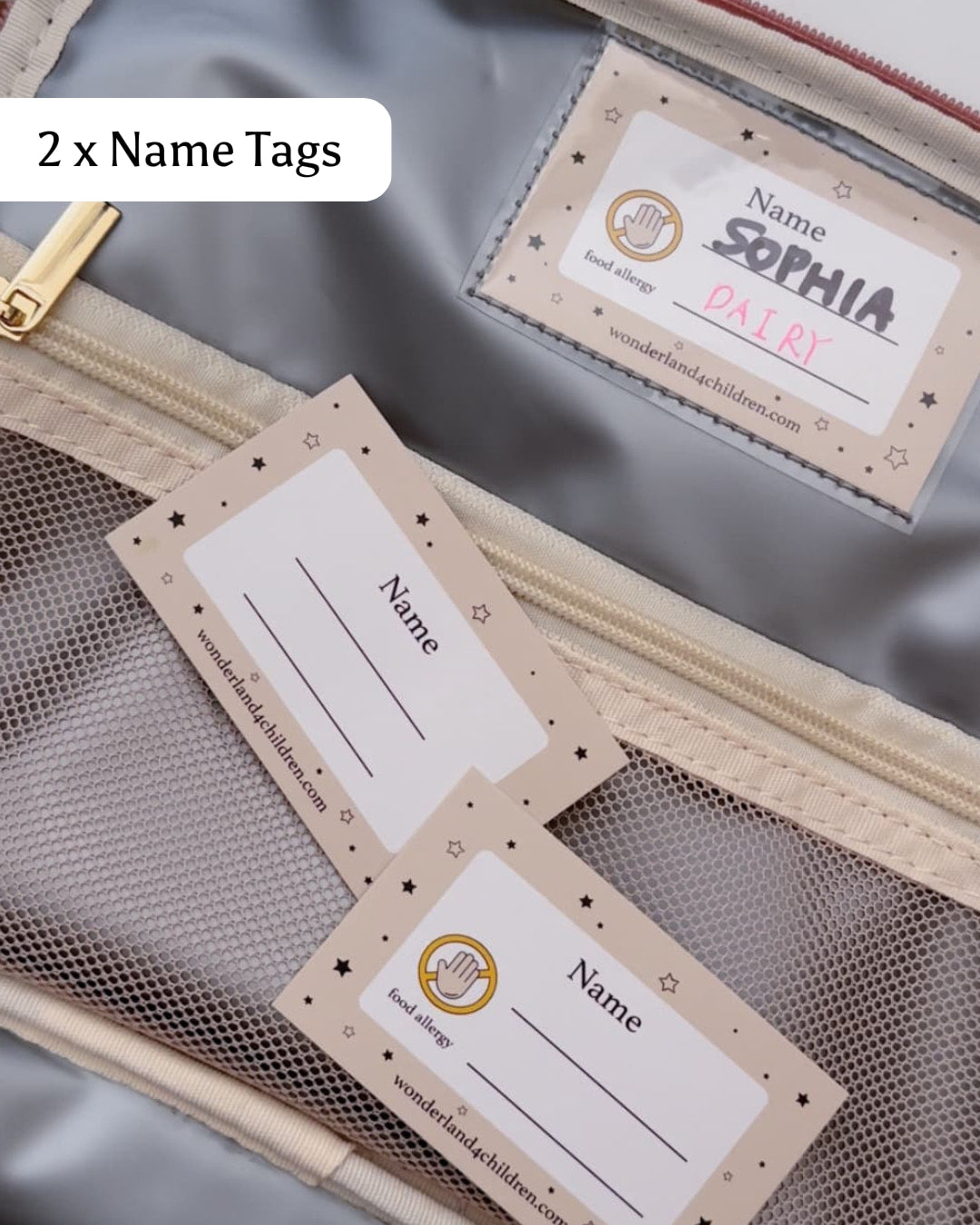 3: Name Card: Flexible, a rewritable name and allergy awareness cards included.