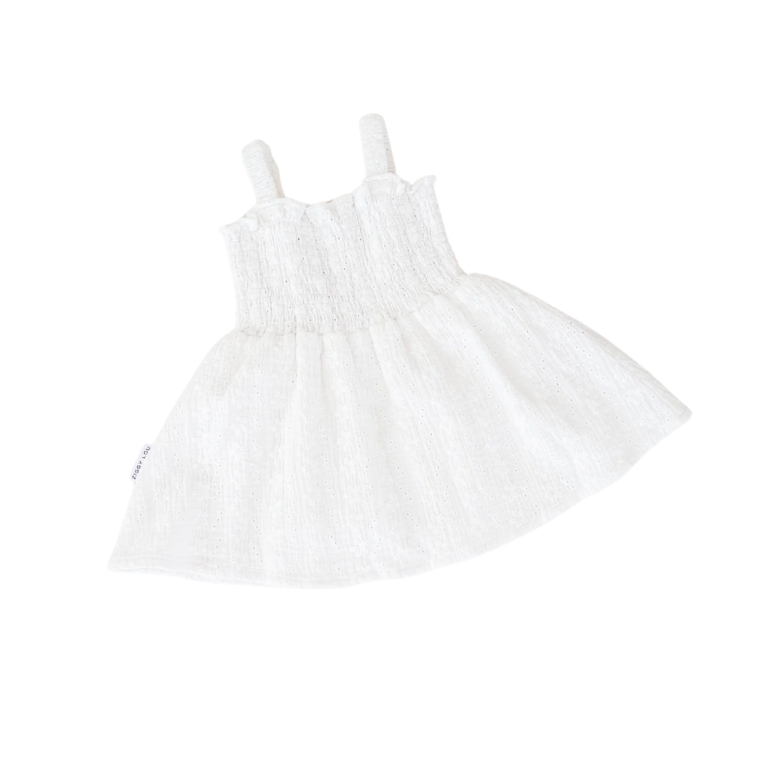 Cotton dress in our Laurel broderie anglaise fabric. Shirred bodice with adjustable button hole straps. Mix and match with items from our Christmas Collection.