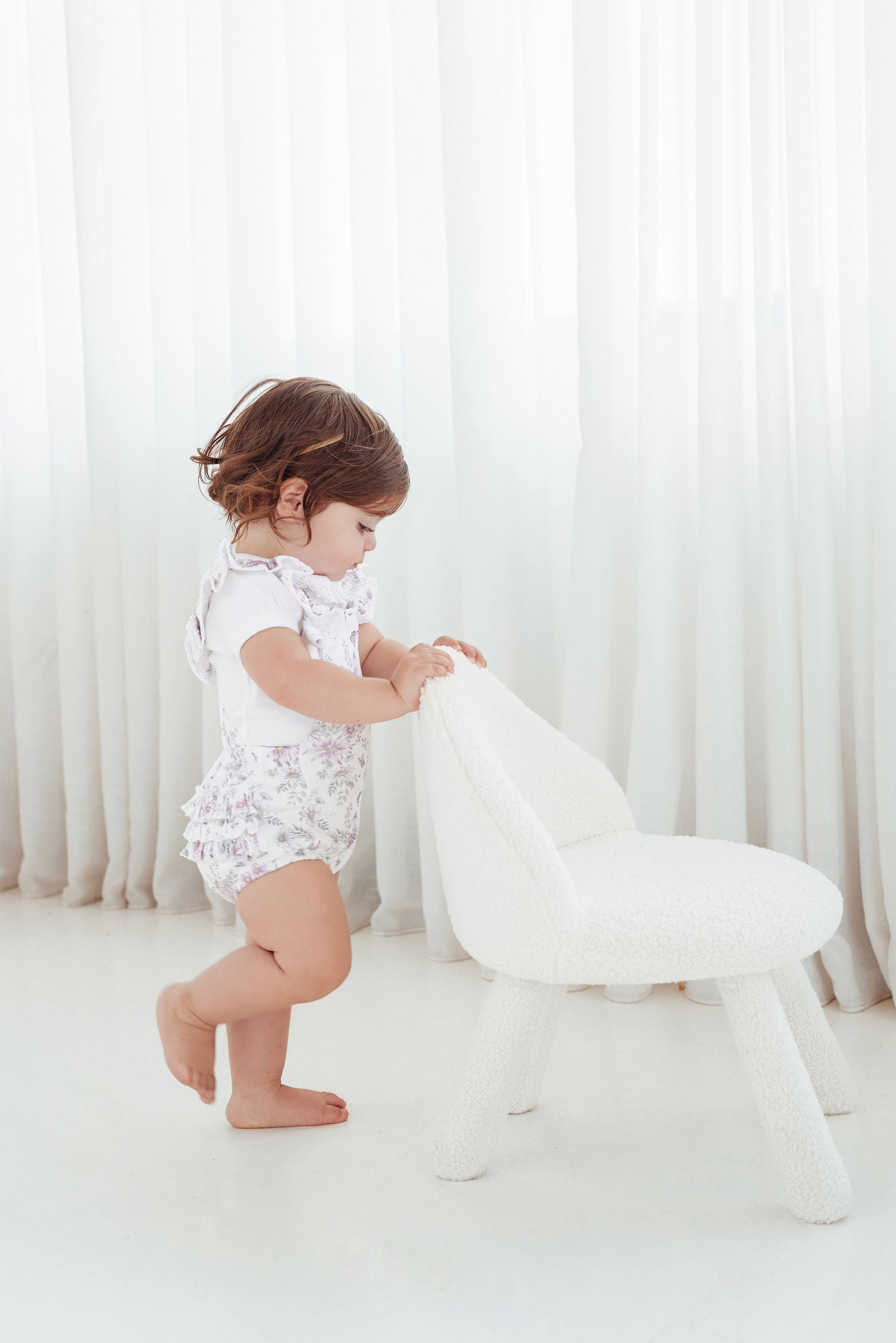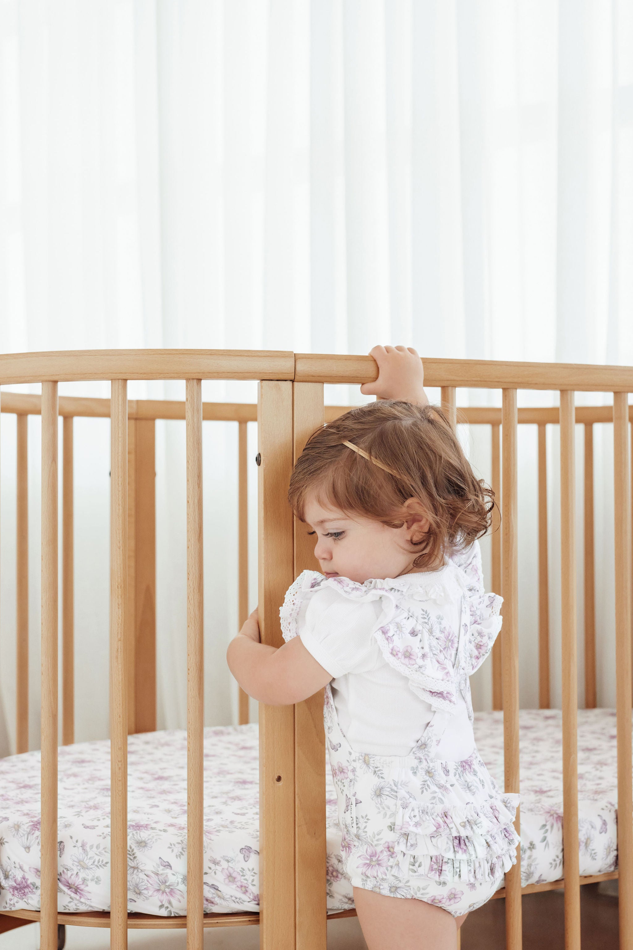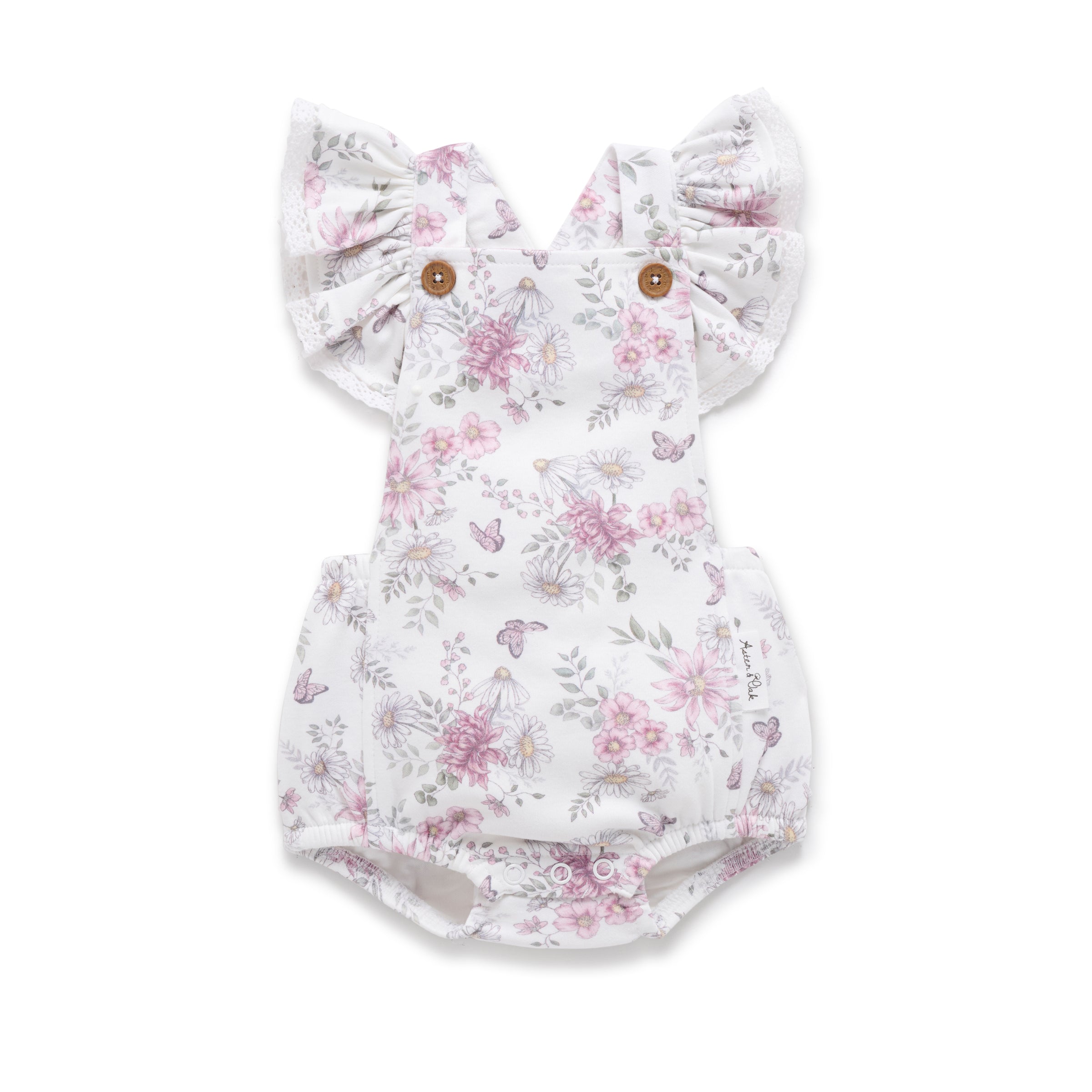 Made from GOTS certified organic cotton, the ruffle playsuit features spring florals, with the back adored with ruffles and adjustable crossover ruffle straps with wood look buttons.