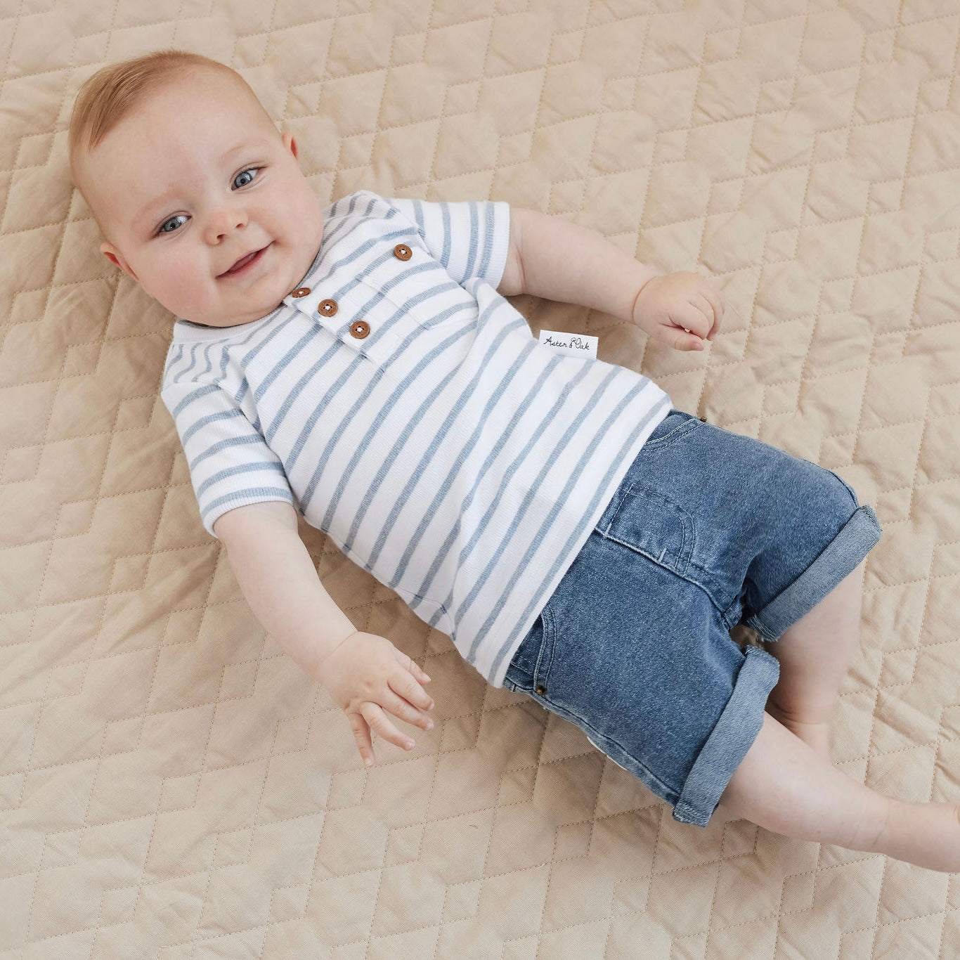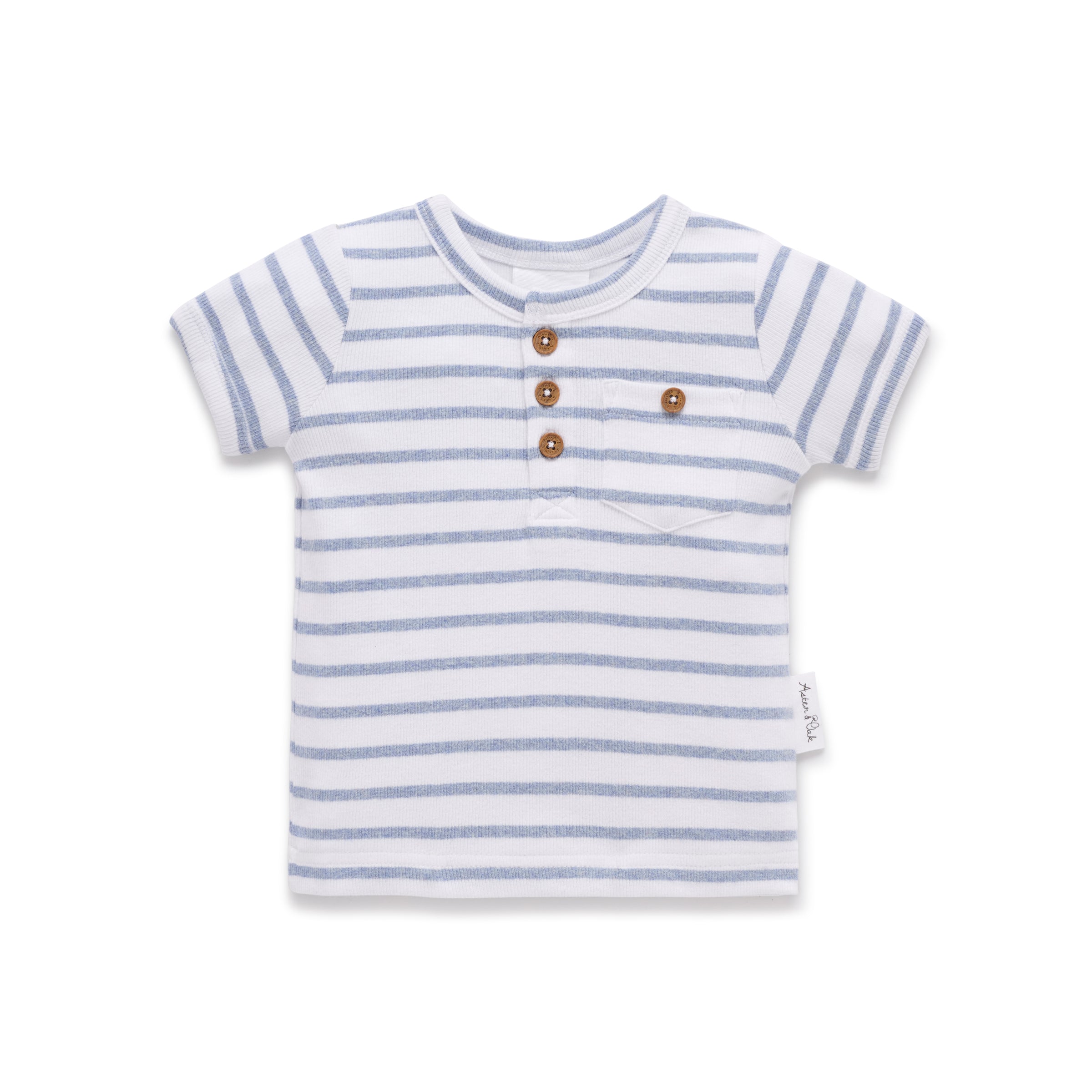 Made from GOTS certified organic cotton, this classic stripe tee features our henley neckline with wood look buttons and functional front pocket.
