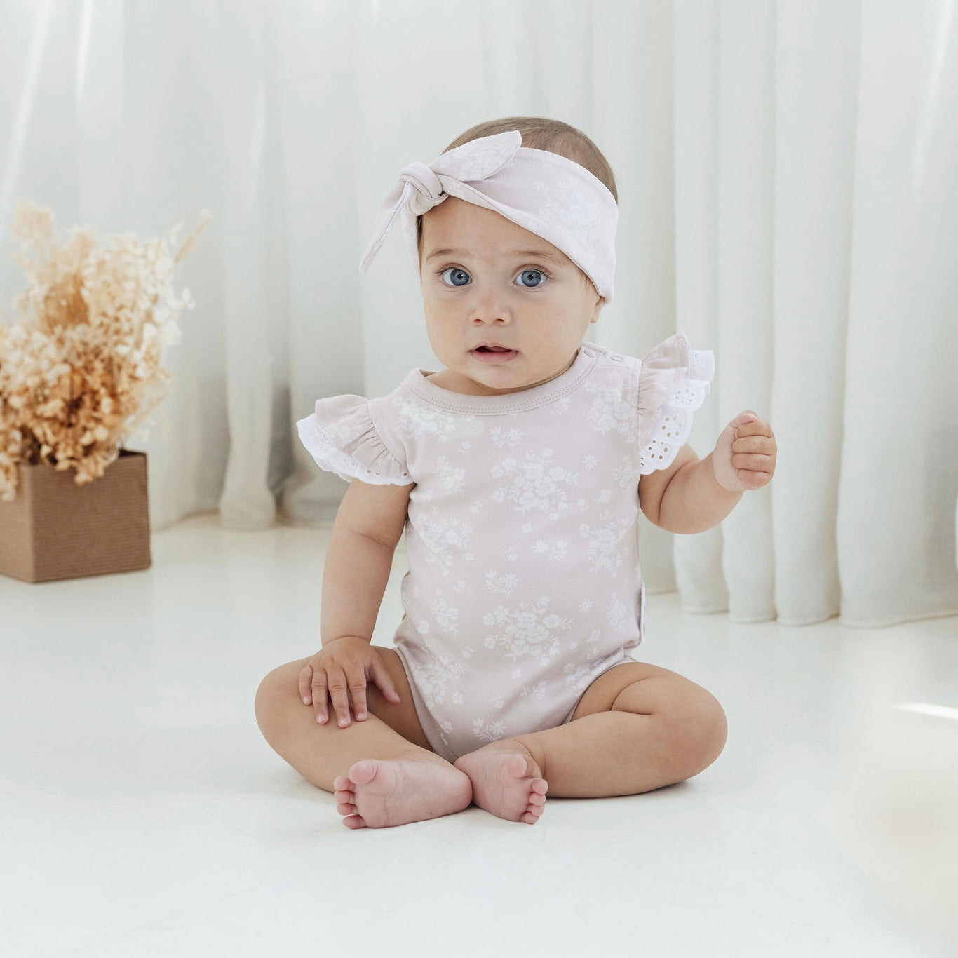 Made from GOTS certified organic cotton, the AOP Onesie features an all over white floral print, ruffled sleeve and premium snap buttons to the shoulder and gusset for changing ease