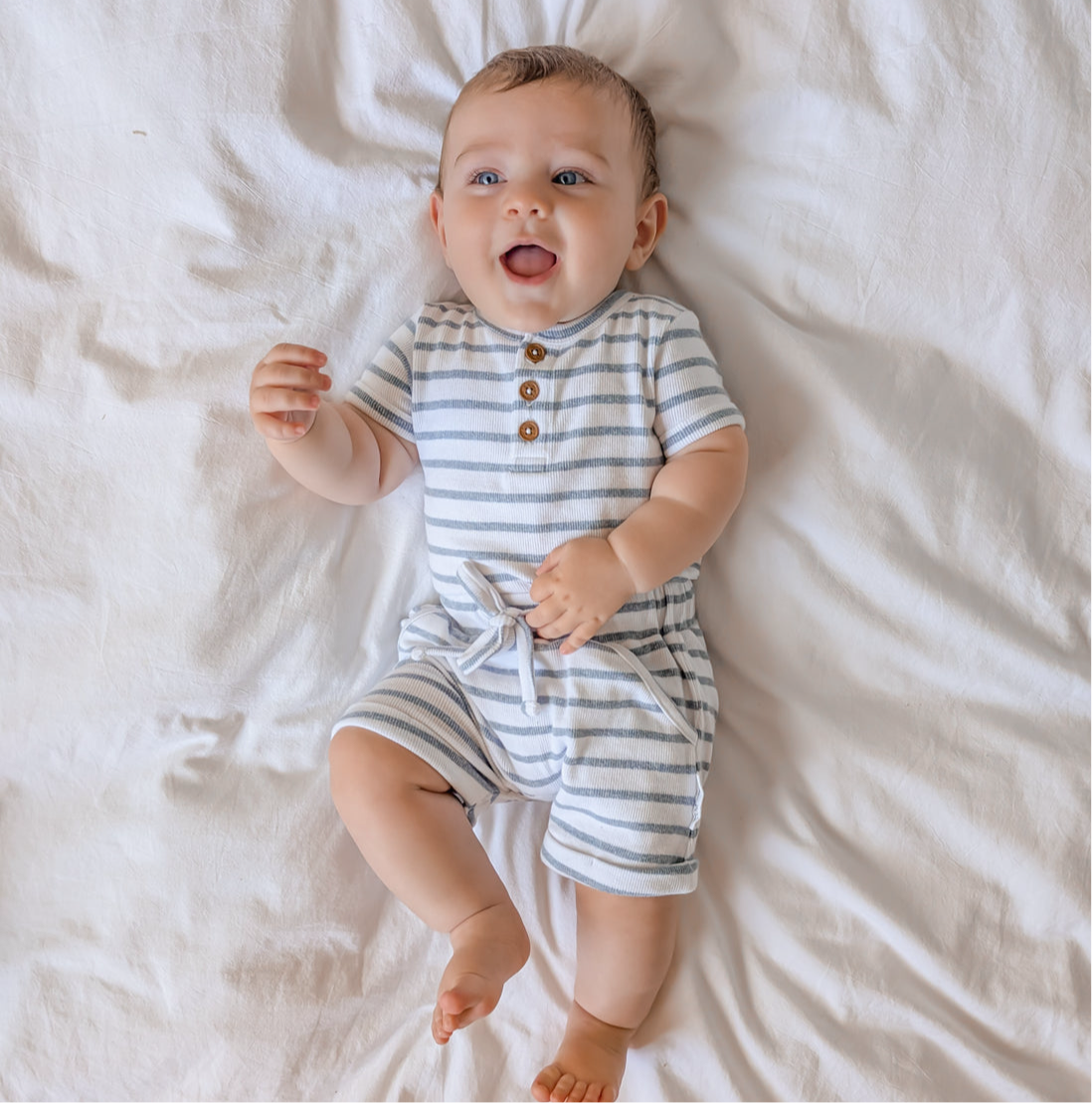 Made from GOTS certified organic cotton, this short sleeve onesie features classic stripe print, functional front faux wooden buttons to neckline along with premium snap buttons to gusset for easy changing.