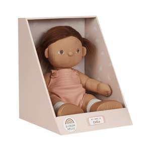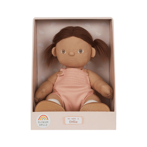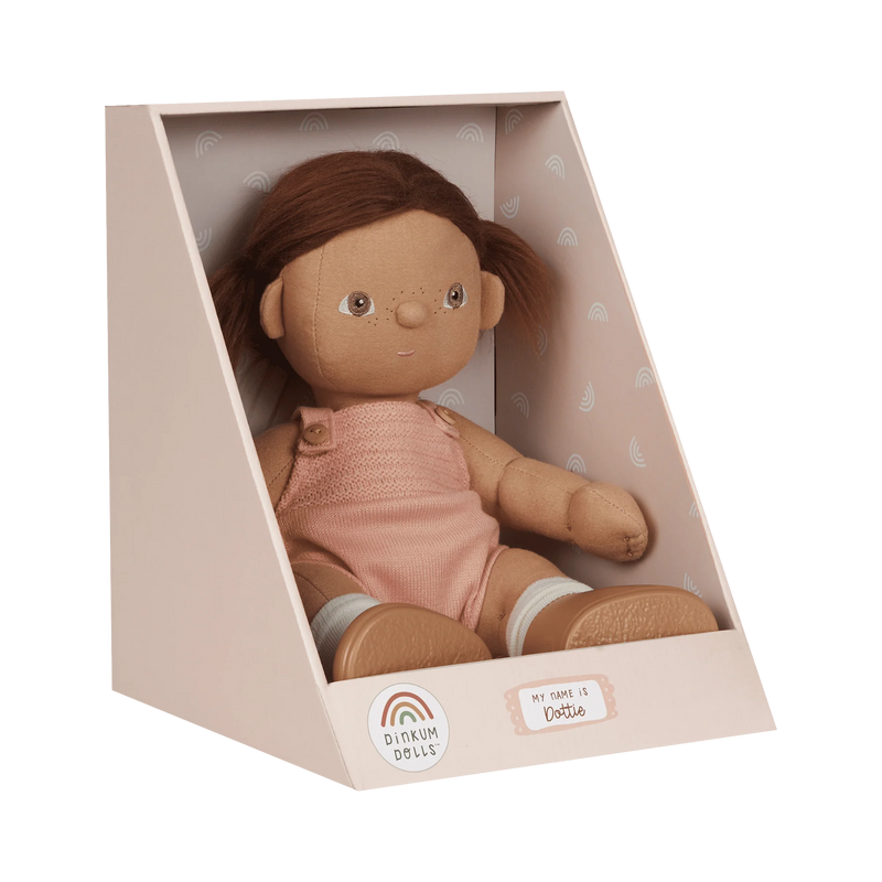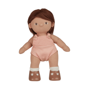 It's not just Dottie’s soft and snuggly body that make her the perfect doll-mate. With her cosy cotton body and soft brown hair, she’s simply made for cuddles. Snuggly, sweet, and always ready for fun, Dottie is dressed to charm in a pink romper with teeny wooden buttons and easy velcro fastenings for little hands. Whether it’s a nap, a tea party, or a grand adventure, Dottie’s ready to tag along and be your little one’s forever friend.