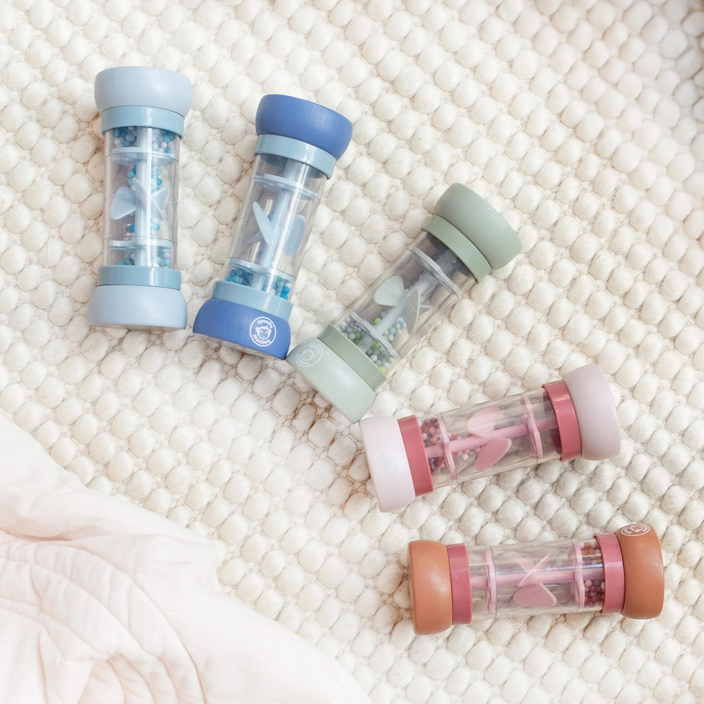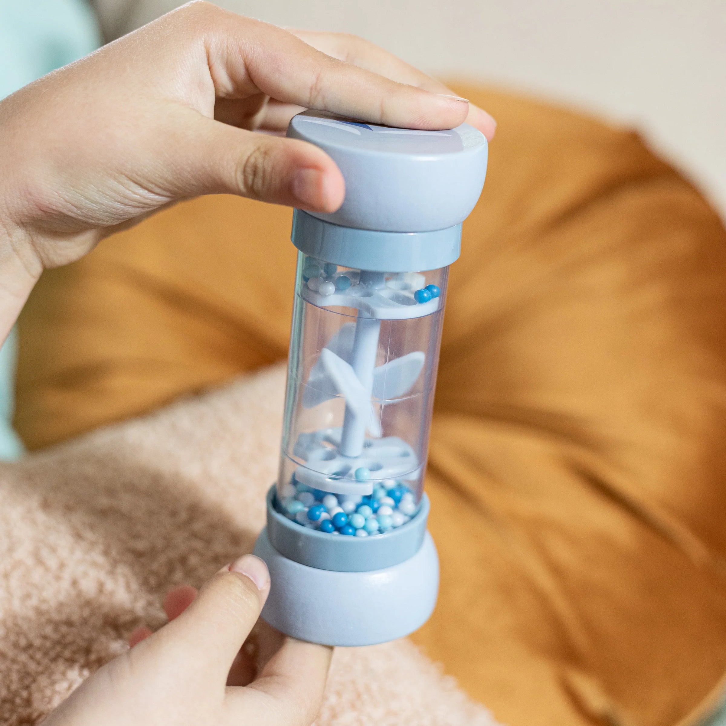 Perfect first musical toy for little kids. Turn this rainmaker over and stimulate senses with trickling beads and soothing raindrop sounds. Perfectly designed shape for toddler hands. Shake it up for added sensory activity. Great for building gross motor skills.  This toy is crafted from sustainably sourced wood from FSC® certified forests and coated with non toxic, child-safe paint.