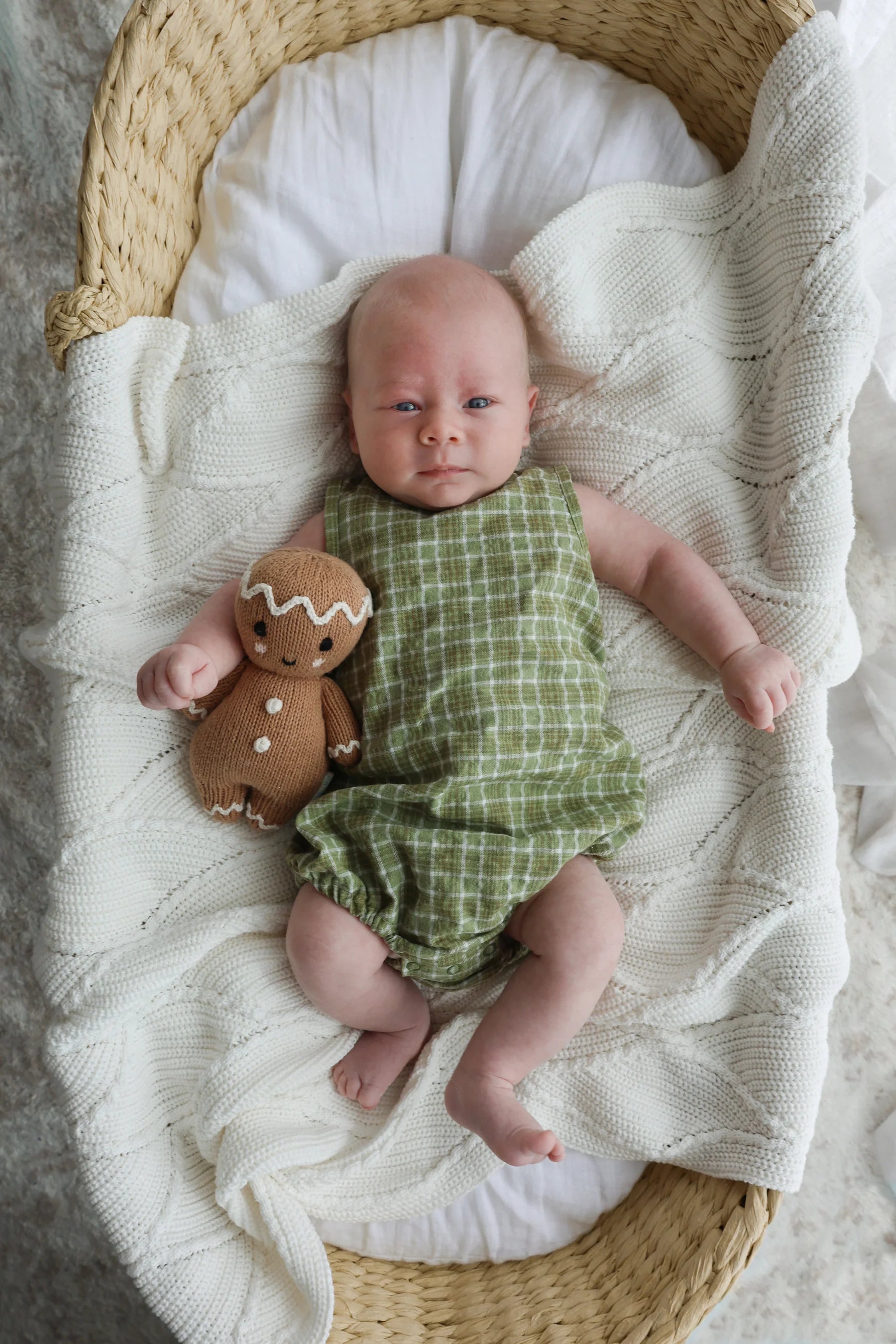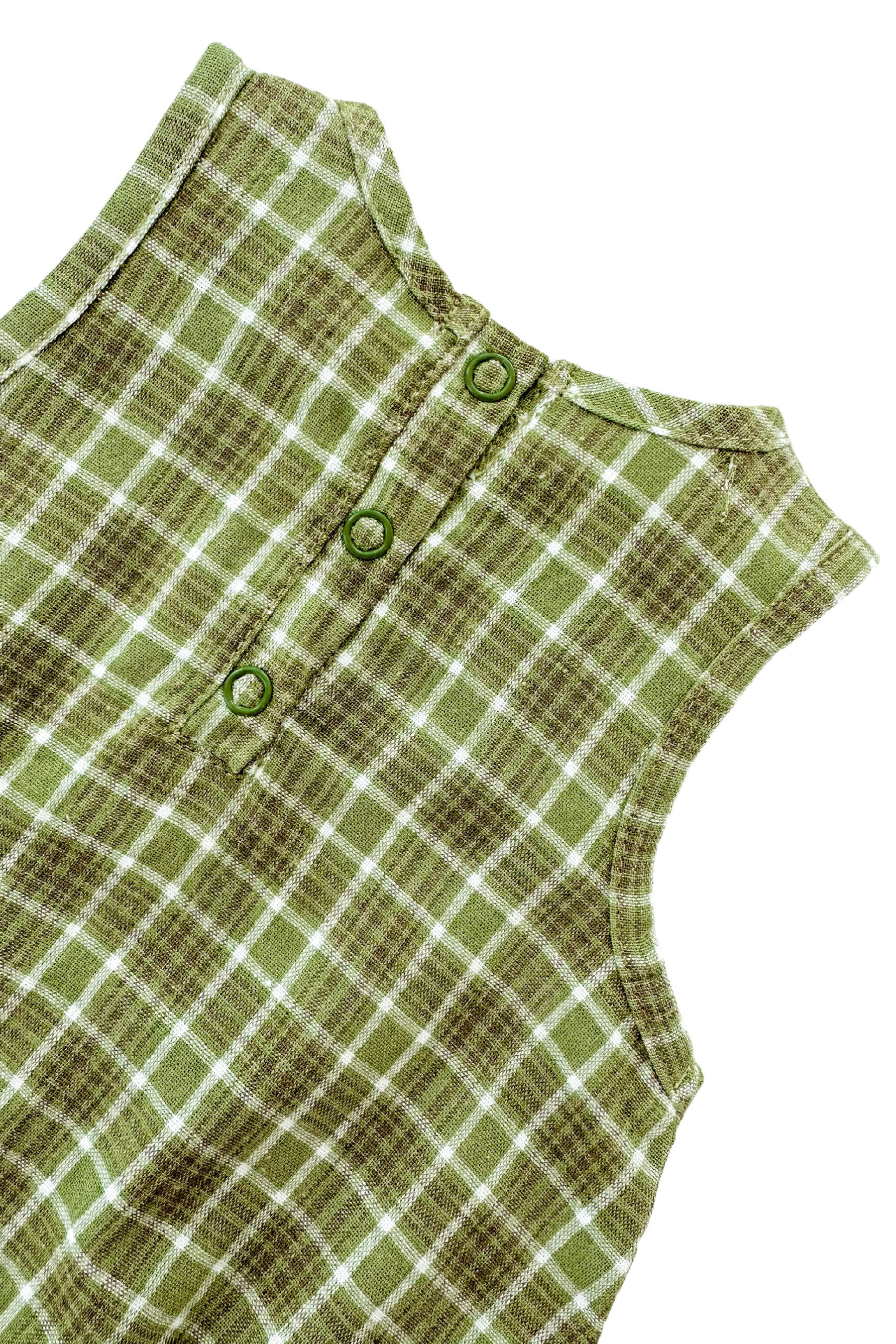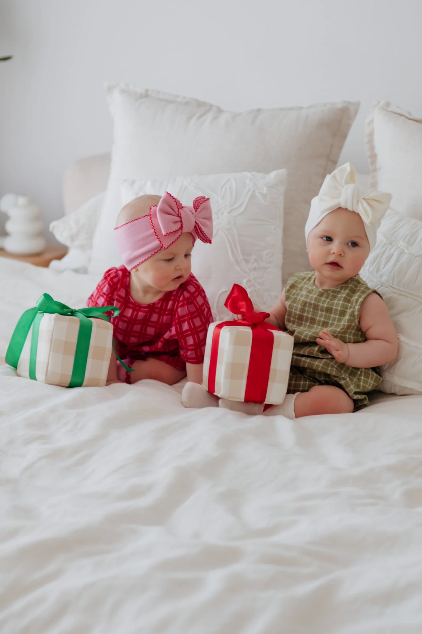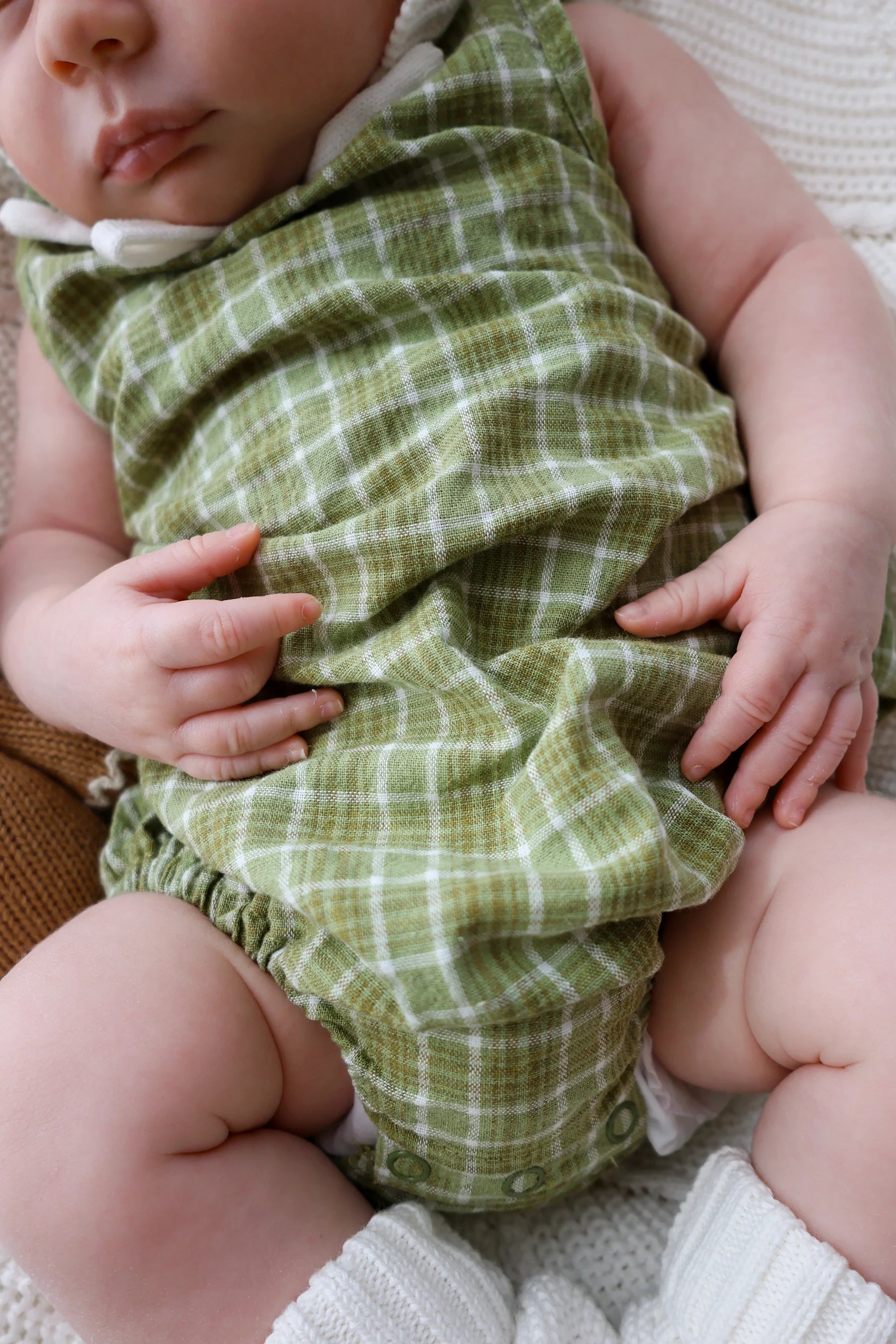 Cotton bubble romper in our Thyme fabric. Functional snap buttons at back of neck and crotch for easy on/off and nappy changes. Mix and match with items from our Christmas Collection.